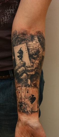While the main theme of the tattoo is not linked directly to gambling, the design is still something to behold. The Joker is synonymous with taking big risks in order to get what he wants. He strikes fear into everyone he comes up against. The three aces at the wrist is also a well-known symbol of gambling, being a very strong hand in a number of games. Again, you can tell the wearer is a fan of spades, with this suit at the front of the other cards. You can tell that the designer spent a lot of time with this gambling tattoo and the end product was well worth the wait!